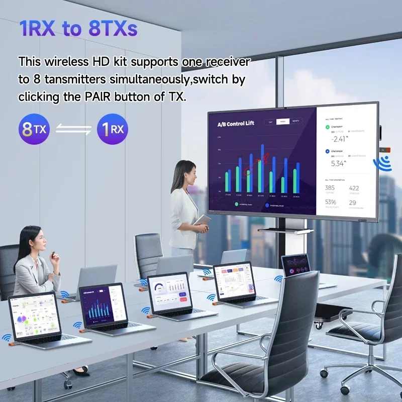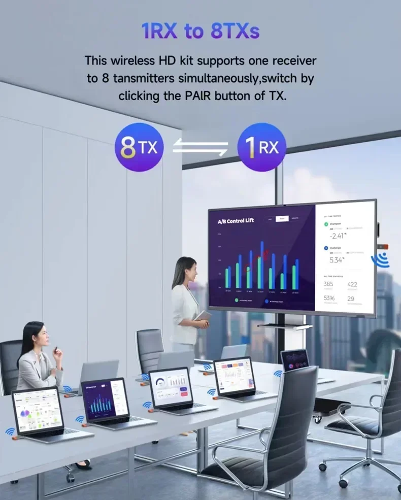 【Many-to-One Mode】8 transmitters can be connected to 1 receiver at the same time, one click switch, does not interfere with each other, and multiple screens can be shared. *Note: This operation requires additional purchase of transmitters, and the 1 receivers can support up to 8 transmitters.